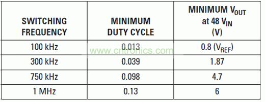 最小可控“導(dǎo)通”時間限制是DC/DC轉(zhuǎn)換器IC的一個特點,其為脈寬調(diào)制(PWM)電路的最窄可達(dá)脈寬。在降壓轉(zhuǎn)換器中,開關(guān)周期期間功率MOSFET導(dǎo)通的時間百分比被稱作占空比,其等于輸出電壓與輸入電壓的比。使用TPS54160轉(zhuǎn)換器時,占空比為0.104(4 V/48 V),而數(shù)據(jù)表中列出的最小“導(dǎo)通”時間為130 ns。可控脈寬限制產(chǎn)生一個最小可達(dá)占空比,而用最小“導(dǎo)通”時間乘以開關(guān)頻率,我們可以輕松地計算出該占空比的大小。一旦知道了最小占空比,利用VIN乘以最小占空比,我們便可以計算出最低可達(dá)輸出電壓。最低輸出電壓同樣也受轉(zhuǎn)換器基準(zhǔn)電壓的限制,使用TPS54160時其為0.8V。