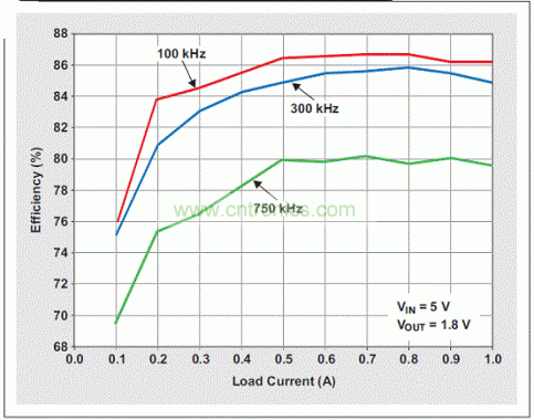 三個例子的重要損耗組成部分,來自于FET驅(qū)動損耗、FET開關(guān)損耗和電感損耗。FET電阻和IC損耗是一致的,因為所有三個設(shè)計中都使用了相同的IC。由于所有例子中都選擇了低ESR的陶瓷電容,因此電容損耗可以忽略不計。為了表明高頻開關(guān)的影響,我們對每個例子的效率都進(jìn)行了測量,并將其顯示在圖2中。該圖清楚地表明,效率隨開關(guān)頻率增加而下降。若想提高所有頻率下的效率,需要尋找到一種全負(fù)載狀態(tài)下低漏到源“導(dǎo)通”電阻、低門電荷或者低靜態(tài)電流規(guī)范的DC/DC轉(zhuǎn)換器;或者尋找到一些具有更低等效電阻的電容和電感。