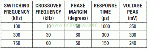 瞬態(tài)響應(yīng)是電源性能級別的一個較好指標(biāo)。我們利用每種電源的波特圖來表明高開關(guān)頻率的對比情況(參見圖3)。如圖所示,每個電源的相位裕度在45°和55°之間,其表明瞬態(tài)響應(yīng)得到較好的抑制。交叉頻率約為開關(guān)頻率的1/8。使用快速開關(guān)DC/DC轉(zhuǎn)換器時,設(shè)計人員應(yīng)確保電源IC誤差放大器具有足夠的帶寬來支持高交叉頻率。TPS54160誤差放大器的單位增益頻寬一般為2.7 MHz。表5顯示了實際瞬態(tài)響應(yīng)時間以及電壓峰值過沖的相關(guān)值。開關(guān)頻率越高,過沖值便越是更低,原因是更寬的帶寬。