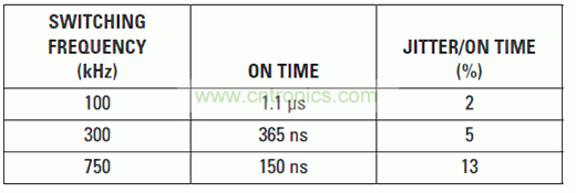 高轉(zhuǎn)換比和更高頻率時,會存在噪聲問題。當(dāng)選擇某個高開關(guān)頻率時,設(shè)計人員應(yīng)考慮抖動和DC/DC轉(zhuǎn)換器的最小“導(dǎo)通”時間。當(dāng)占空比較小時,抖動噪聲便為開關(guān)脈沖的更大百分比。表6顯示了48-V到5-V轉(zhuǎn)換比時,抖動與“導(dǎo)通”時間之比。我們假設(shè),在該相位節(jié)點上存在0.5-V二極管壓降和20-ns抖動。