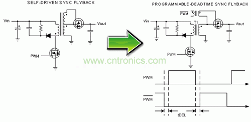 在自驅(qū)動(dòng)同步反向電源中,輸出二極管被一個(gè) N 通道 MOSFET 代替,同時(shí)必須向電源變壓器添加一個(gè)繞組以生成同步柵極驅(qū)動(dòng)信號(hào)。相比輸出二極管整流器,該同步MOSFET的低導(dǎo)通電阻可帶來更低的傳導(dǎo)損耗,這就極大地提高了高負(fù)載電流時(shí)的效率。