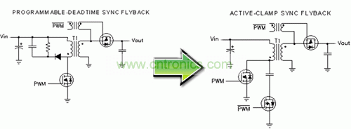 圖 4 描述了如何進(jìn)一步提高效率并利用同步 MOSFET 柵極驅(qū)動(dòng)信號(hào)來控制一個(gè)有源主緩沖器。這種結(jié)構(gòu)通常被稱為有源鉗位反向結(jié)構(gòu)。在前面示意圖中,我們已經(jīng)使用 RCD 緩沖器來降低一次側(cè) MOSFET 漏-源-電壓的電壓峰值。該電壓峰值出現(xiàn)在一次側(cè) MOSFET 關(guān)閉時(shí),這主要是由于變壓器主繞組的泄露能量造成的。RCD 緩沖器消耗了其緩沖器電阻中的這種能量。在有源鉗位反向結(jié)構(gòu)中,泄露能量由鉗位電容捕獲,并被帶至負(fù)載再循環(huán),最后返回到輸入。這就構(gòu)成了一個(gè)實(shí)際上無(wú)損耗的緩沖器。RCD 緩沖器的漏-源極-電壓波形和一個(gè)有源鉗位的對(duì)比關(guān)系如圖 5 所示。該有源鉗位消除了高頻峰值。除消除漏能損耗以外,開關(guān)損耗和 EMI 也得到了極大降低。在許多情況下,這種有源鉗位緩沖器允許使用低漏-源-電壓額定值的一次側(cè) MOSFET,從而進(jìn)一步降低了損耗,并有可能降低 MOSFET 的成本。