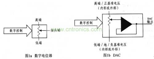 利用數(shù)字輸入控制微調(diào)模擬輸出有兩種選擇:數(shù)字電位器和數(shù)/模轉(zhuǎn)換器(DAC),兩者均采用數(shù)字輸入控制模擬輸出。通過數(shù)字電位器可以調(diào)整模擬電壓;通過DAC既可以調(diào)整電流,也可以調(diào)整電壓。電位器有三個模擬連接端:高端、抽頭端(或模擬輸出)和低端(見圖1a)。DAC具有隊應(yīng)的三個端點:高端對應(yīng)于正基準電壓,抽頭端對應(yīng)于DAC輸出,低端則可能對應(yīng)于接地端或負基準電壓端(見圖1b)。