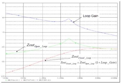 由于該圖形以對(duì)數(shù)表示,即簡(jiǎn)單的減法,因此在增益較高的低頻率區(qū)域阻抗會(huì)大大降低;在增益較少的高頻率區(qū)域閉環(huán)和開環(huán)阻抗基本上是一樣的。在 此需要說明如下要點(diǎn):1)峰值環(huán)路阻抗出現(xiàn)在電源交叉頻率附近,或出現(xiàn)在環(huán)路增益等于 1(或 0dB)的地方;以及 2)在大部分時(shí)間里,電源控制帶寬都將會(huì) 高于濾波器諧振,因此峰值閉環(huán)阻抗將取決于交叉頻率時(shí)的輸出電容阻抗。