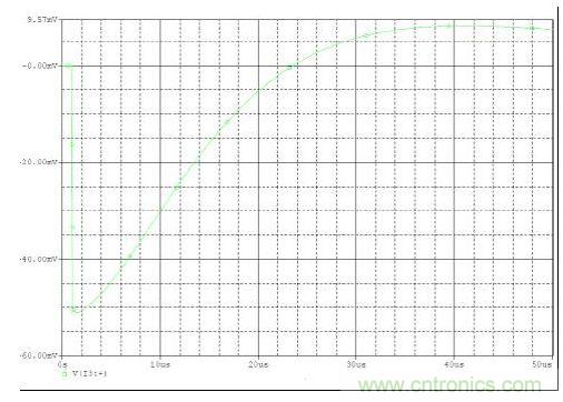下面是一個(gè)如何使用上述關(guān)系的示例。問題是根據(jù)200kHz開關(guān)電源10 amp變化幅度允許范圍內(nèi)的50mV輸出變化挑選一個(gè)輸出電容。所允許的峰值輸 出阻抗為:Zout=50 mV / 10 amps 或5毫歐。這就是最大允許輸出電容ESR。接下來就是建立所需的電容。幸運(yùn)的是,ESR和電容均為正交型,可單獨(dú)處理。一 個(gè)高 (Aggressive) 電源控制環(huán)路帶寬可以是開關(guān)頻率的1/6或30kHz。于是在 30 kHz 時(shí)輸出濾波電容就需要一個(gè)不到5毫歐的電抗,或高于1000uF的電容。 圖2顯示了在5毫歐ESR、1000uF電容以及30 kHz電壓模式控制條件時(shí)這一問題的負(fù)載瞬態(tài)仿真。就校驗(yàn)這一方法是否有效的10amp負(fù)載變動(dòng)幅度而言, 輸出電壓變化大約為52mV。