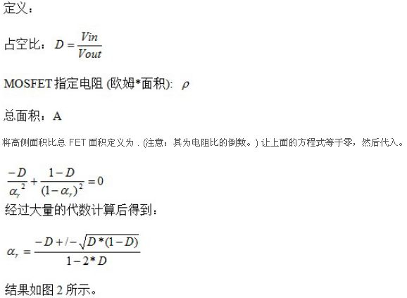 通過(guò)圖1,我們知道50%轉(zhuǎn)換比率時(shí)出現(xiàn)最佳傳導(dǎo)損耗極值。但是,在其他轉(zhuǎn)換比率條件下,可以將損耗降至這一水平以下。附錄給出了進(jìn)行這種優(yōu)化的數(shù)學(xué)計(jì)算方法,而圖2顯示了其計(jì)算結(jié)果。即使在極低的轉(zhuǎn)換比率條件下,F(xiàn)ET芯片面積的很大一部分都應(yīng)該用于高側(cè)FET。高轉(zhuǎn)換比率時(shí)同樣如此;應(yīng)該有很大一部分面積用于低側(cè)。這些結(jié)果是對(duì)這一問(wèn)題的初步研究,其并未包括如高側(cè)和低側(cè)FET之間的各種具體電阻值,開(kāi)關(guān)速度的影響,或者對(duì)這種芯片面積進(jìn)行封裝相關(guān)的成本和電阻等諸多方面。但是,它為確定FET之間的電阻比提供了一個(gè)良好的開(kāi)端,并且應(yīng)會(huì)在FET選擇方面實(shí)現(xiàn)更好的整體折中。