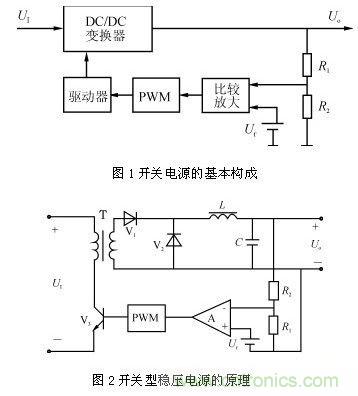 開關(guān)電源采用功率半導(dǎo)體器件作為開關(guān)器件,通過周期性間斷工作,控制開關(guān)器件的占空比來調(diào)整輸出電壓。開關(guān)電源的基本構(gòu)成如圖1所示,其中DC/DC變換器進(jìn)行功率轉(zhuǎn)換,它是開關(guān)電源的核心部分,此外還有起動(dòng)、過流與過壓保護(hù)、噪聲濾波等電路。輸出采樣電路(R1、R2)檢測輸出電壓變化,與基準(zhǔn)電壓Ur比較,誤差電壓經(jīng)過放大及脈寬調(diào)制(PWM)電路,再經(jīng)過驅(qū)動(dòng)電路控制功率器件的占空比,從而達(dá)到調(diào)整輸出電壓大小的目的。圖2是一種電路實(shí)現(xiàn)形式。