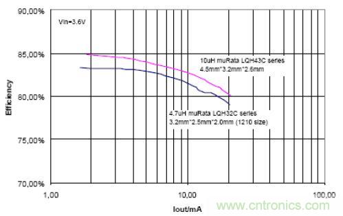 圖 10 顯示整個鋰離子電池電壓范圍(2.7V~4.2V)內(nèi)均可以實現(xiàn) 80% 以上的效率。在此應(yīng)用中,使用了一個高度僅為 1.2mm 的電感 (Sumida CMD4D11-4R7, 3.5mm*5.3mm*1.2mm)。 從圖 10 中的效率曲線可以看出:在大多數(shù)應(yīng)用中,升壓轉(zhuǎn)換器可以實現(xiàn)比充電泵解決方案更高的效率。但是,在無線應(yīng)用中使用升壓轉(zhuǎn)換器或充電泵時還需要考慮 EMI 問題。