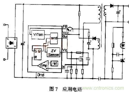 由(9),(10)或可知,調(diào)節(jié)輸出功率、穩(wěn)定輸出電壓可以調(diào)節(jié)導(dǎo)通時(shí)間或占空比或調(diào)頻方式或幾種方式綜合應(yīng)用。當(dāng)輸出功率下降或電源電壓上升,導(dǎo)通時(shí)間減小,反之導(dǎo)通時(shí)間增加;隨輸出功率的增加或減小變壓器初次級(jí)電流峰值均增加或減小,由式(3)可知變壓器的釋放儲(chǔ)能時(shí)間也隨之增加或減少,為實(shí)現(xiàn)“零電壓”開關(guān),變壓器不能工作在間歇狀態(tài),因此F%IM控制方式不能滿足本文電路的“零電壓”開通的要求?;谏鲜龉ぷ鳁l件的約束,本文電路應(yīng)采用輸出電壓反饋控制導(dǎo)通時(shí)間,用“零電壓”檢測(cè)控制開關(guān)管導(dǎo)通時(shí)刻,即調(diào)頻、調(diào)占空比工作方式。具體電路可以采用通用器件組合,如圖7。