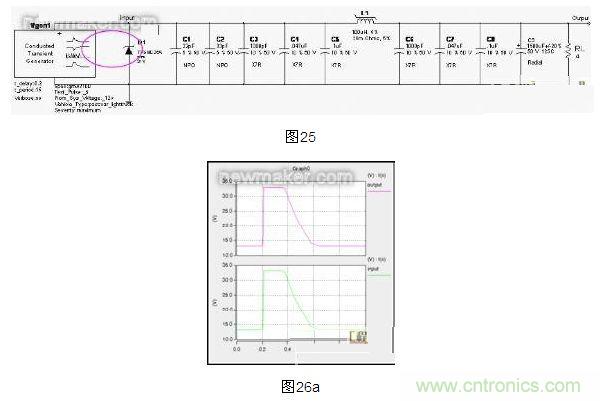 2) 脈沖2a 模擬由于線束電感的原因,使與DUT并聯(lián)的裝置內(nèi)電流突然中斷引起的瞬態(tài)現(xiàn)象;脈沖2b 模擬直流電機(jī)充當(dāng)發(fā)電機(jī),在點(diǎn)火開關(guān)斷開時(shí)的瞬態(tài)現(xiàn)象。仿真結(jié)果見圖15a。