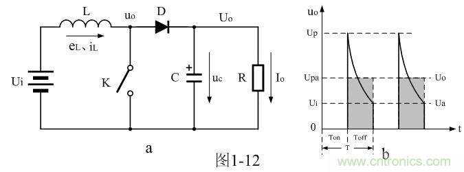 在圖1-12-a中,當控制開關(guān)K接通時,輸入電源Ui開始對儲能電感L加電,流過儲能電感L的電流iL開始增加,同時電流在儲能電感L中也要產(chǎn)生反電動勢eL;當控制開關(guān)K由接通轉(zhuǎn)為關(guān)斷的時候,在儲能電感L兩端就會產(chǎn)生反電動勢eL。eL反電動勢的方向與開關(guān)K關(guān)斷前的方向相反,但與電流的方向相同,因此,在控制開關(guān)K兩端的輸出電壓uo等于輸入電壓Ui與反電動勢eL之和。