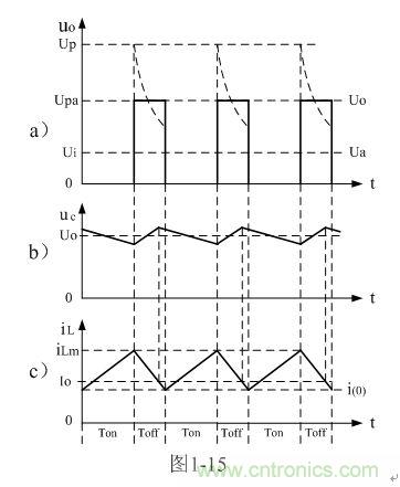 圖2-13-a、圖2-14-a、圖2-15-a分別為開關(guān)電源工作于臨界電流連續(xù)、電流不連續(xù)、電流連續(xù)狀態(tài)時,圖2-12-a電路中各點的電壓、電流波形。圖2-13-b、圖2-14-b、圖2-15-b分別為3種狀態(tài)之下,濾波電容兩端的紋波電壓波形。圖2-13-c、圖2-14-c、圖2-15-c分別為3種狀態(tài)之下,流過儲能電感的電流波形。不過,圖中這些波形相對來說還是比較粗略和簡單的,如需要對它們更嚴密的表達和分析,請參考后面圖1-24和圖1-25相關(guān)的內(nèi)容。