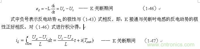 式中的負號表示反電動勢eL的極性與(1-35)式中的符號相反,即: K關(guān)斷期間電感L產(chǎn)生電動勢的方向與K接通期間電感L產(chǎn)生電動勢的方向正好相反。
