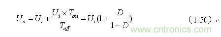當并聯(lián)式開關(guān)電源工作于電流臨界連續(xù)狀態(tài)時,流過儲能電感的初始電流i(0)等于0(參看圖1-13),即:(1-49)式中流過儲能電感電流的最小值iLX等于0。因此,由(1-45)和(1-49)式,可求得并聯(lián)式開關(guān)電源輸出電壓Uo為: