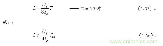 (1-55)和(1-56)式,就是計算并聯(lián)式開關(guān)電源儲能電感的公式。同理,(1-55)和(1-56)式的計算結(jié)果,只給出了計算并聯(lián)式開關(guān)電源儲能電感L的中間值,或平均值,對于極端情況可以在平均值的計算結(jié)果上再乘以一個大于1的系數(shù)。