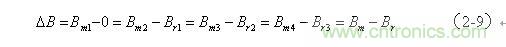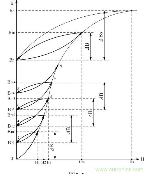 同理,當(dāng)?shù)诙€直流脈沖加到變壓器初級線圈a、b兩端時(shí),變壓器鐵芯中的磁感應(yīng)強(qiáng)度B將按圖2-2中新的磁化曲線2-3上升,磁感應(yīng)強(qiáng)度被磁場強(qiáng)度磁化到第二個最大值Bm2,使磁感應(yīng)強(qiáng)度產(chǎn)生一個增量ΔB,  。
