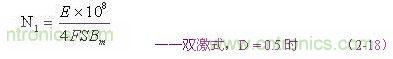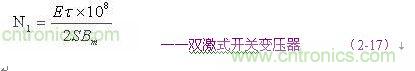(2-17)和(2-18)式,為計(jì)算雙激式開關(guān)變壓器初級(jí)線圈N1繞組匝數(shù)的公式。式中,N1為變壓器初級(jí)線圈N1繞組的最少匝數(shù),S為變壓器鐵芯的導(dǎo)磁面積(單位:平方厘米),Bm為變壓器鐵芯的最大磁感應(yīng)強(qiáng)度(單位:高斯),τ為脈沖寬度,或電源開關(guān)管的導(dǎo)通時(shí)間(單位:秒),E為脈沖電壓的幅度,單位為伏,F(xiàn)為開關(guān)電源的工作頻率,單位赫芝。
