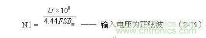 (2-19)式為計(jì)算正弦波電源變壓器初級(jí)線圈N1繞組匝數(shù)的公式。式中,N1為變壓器初級(jí)線圈N1繞組的最少匝數(shù),S為變壓器鐵芯的導(dǎo)磁面積(單位:平方厘米),Bm為變壓器鐵芯的最大磁感應(yīng)強(qiáng)度(單位:高斯),U為正弦波輸入電壓有效值,單位為伏,F(xiàn)為正弦波的頻率,單位赫芝。