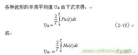 (2-19)、(2-20)式中,Ua和Ua-分別為各種波形的正、負(fù)半周平均值,Pu(t)和Nu(t)分別為各種波形的正波形函數(shù)(正半周)和負(fù)波形函數(shù)(負(fù)半周),T為所選波形的周期。大部分交流電壓波形,其正、負(fù)半周平均值的絕對(duì)值都相等,但符號(hào)相反。