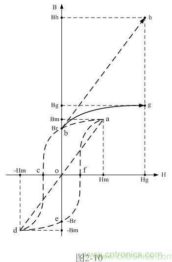 在圖2-10中,虛線表示的磁化曲線a-b-c-d-e-f-a為雙激開關(guān)變壓器鐵芯正常工作時(shí)的磁滯回線,虛線線段d-a是把開關(guān)變壓器鐵芯的磁化曲線理想化后得到的一條曲線(直線),理想磁化曲線是一條斜率等于最大磁感應(yīng)強(qiáng)度增量與最大磁場(chǎng)強(qiáng)度增量之比,且經(jīng)過坐標(biāo)原點(diǎn)的直線;當(dāng)直線不經(jīng)過坐標(biāo)原點(diǎn)時(shí),這條直線可稱為等效磁化曲線(如線段bh)。理想磁化曲線只有一條,但等效磁化曲線卻有無數(shù)多條,且每條效磁化曲線均與理想磁化曲線平行。