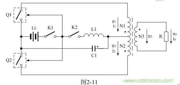 在圖2-11中,開機(jī)時(shí),驅(qū)動(dòng)電路電源開關(guān)K1首先接通,電源Ui首先給電源開關(guān)管Q1、Q2的驅(qū)動(dòng)電路加電;然后開關(guān)管電源開關(guān)K2接通,由于L1的作用,C1兩端的電壓只能緩慢上升,以保證加到變壓器初級(jí)線圈的電壓不會(huì)突然升高,使流過變壓器初級(jí)線圈的電流過大,導(dǎo)致變壓器鐵芯出現(xiàn)飽和;關(guān)機(jī)時(shí),開關(guān)管電源開關(guān)K2首先關(guān)斷,而后驅(qū)動(dòng)電路電源開關(guān)K1再關(guān)斷,由于C1兩端的電壓緩慢下降,使變壓器鐵芯可進(jìn)行充分退磁,以保證下次開機(jī)的時(shí)候,變壓器鐵芯磁滯回線的初始相位總是從0開始。