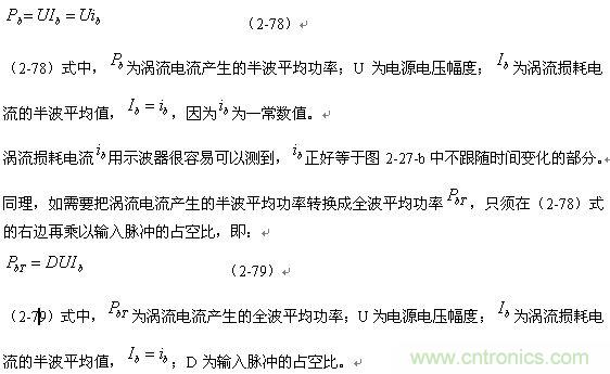 順便指出:(2-79)式的結(jié)果,是認(rèn)為渦流損耗在t1-t2期間(圖2-27-b)完全等于0而求得的,但實(shí)際上,在t1-t2期間變壓器初級(jí)線圈產(chǎn)生的反電動(dòng)勢(shì)同樣也會(huì)在變壓器鐵芯中感應(yīng)產(chǎn)生渦流損耗電流,即當(dāng)輸入電壓為0時(shí)刻,在變壓器鐵芯中還存在很短暫時(shí)間的渦流損耗;由于這種渦流損耗是由反電動(dòng)勢(shì)提供能量來(lái)維持的,它將隨著反電動(dòng)勢(shì)能量的衰減很快就衰減到0。