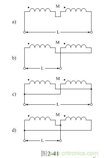 【說明】互感M有正負,圖2-41-a和圖2-41-c的接法互感M為正,圖2-41-b和圖2-41-d的接法互感M為負。兩個線圈之間的互感M為: