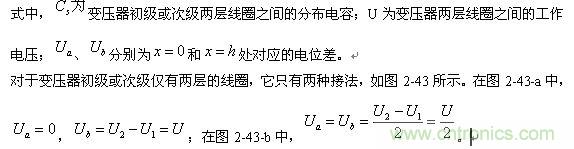 對(duì)于圖2-43-b,可求得變壓器初級(jí)或次級(jí)兩層線圈之間的分布電容為: