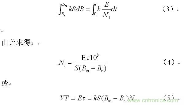 (4)式就是計(jì)算開關(guān)變壓器初級(jí)線圈N1繞組匝數(shù)的公式。式中,N1為開關(guān)變壓器初級(jí)線圈N1繞組的最少匝數(shù),S為開關(guān)變壓器鐵心的導(dǎo)磁面積,單位:平方厘米;Bm為開關(guān)變壓器鐵心的最大磁感應(yīng)強(qiáng)度,單位:高斯;Br為開關(guān)變壓器鐵心的剩余磁感應(yīng)強(qiáng)度,單位:高斯),Br一般簡(jiǎn)稱剩磁;τ = Ton,為控制開關(guān)的接通時(shí)間,簡(jiǎn)稱脈沖寬度,或電源開關(guān)管導(dǎo)通時(shí)間的寬度,單位:秒;E為工作電壓,單位為伏。式中的指數(shù)(k = 108)是統(tǒng)一單位用的,選用不同單位制,指數(shù)的值也不一樣,這里選用CGS單位制,即:長(zhǎng)度為厘米(cm),磁感應(yīng)強(qiáng)度為高斯(Gs),磁通單位為麥克斯韋(Mx)。