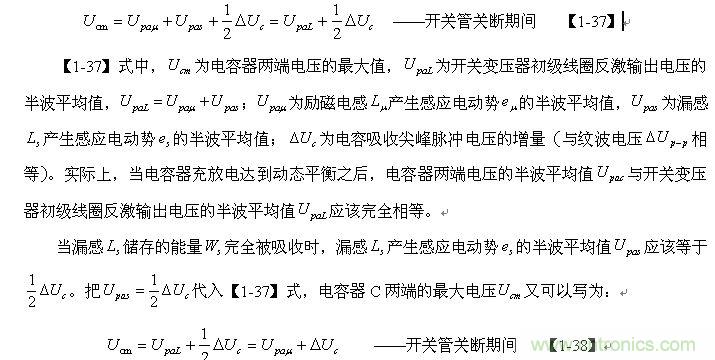 【1-48】和【1-49】式就是我們用來計(jì)算RCD尖峰脈沖吸收電路參數(shù),電阻R、電容器C的容量、電容吸收尖峰脈沖的電壓增量 、以及開關(guān)變壓器初級(jí)線圈反激輸出電壓的半波平均值 Upal 和開關(guān)管導(dǎo)通時(shí)間Ton等參數(shù)的關(guān)系式。