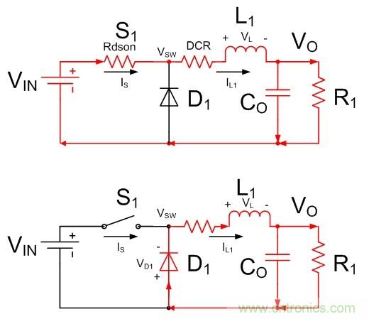 88%只是理想情況下的理論計(jì)算值。實(shí)際中,需要考慮續(xù)流二極管D1的壓降,開關(guān)管S1的導(dǎo)通壓降,以及電感L1的直流阻抗的壓降,如圖3所示。