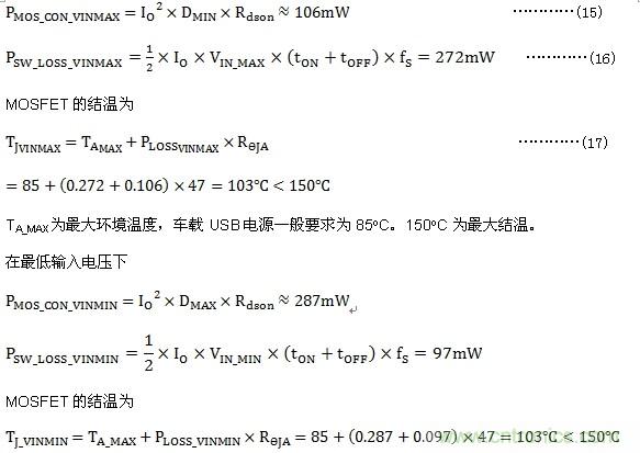 取VO=5V,IO=2A,VD=0.3V, Rdson=50m?, DCR=70m?, 可以得到該情況下,輸入電壓最低可為: