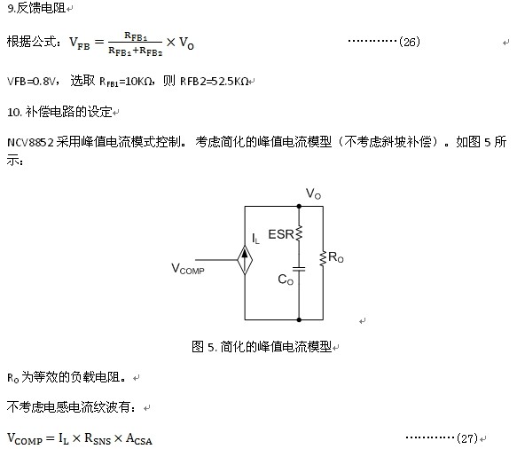 NCV8852是一款外接P溝道MOSFET的非同步BUCK 控制器。輸入電壓可高達(dá)44V,適用于12V蓄電池系統(tǒng)。 采用峰值電流控制,系統(tǒng)易于穩(wěn)定,響應(yīng)快??赏ㄟ^在ROSC管腳外接電阻將工作頻率設(shè)定在100kHz 到500kHz。圖4為NCV8852的典型應(yīng)用電路。ISNS管腳檢測上管電流,用于峰值電流控制以及過流保護(hù)。COMP管腳為誤差放大器的輸出,外接RC電路以補(bǔ)償環(huán)路。