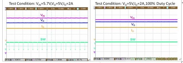 根據(jù)公式2,如果需要實(shí)現(xiàn)在VIN=5.7V下,保證VO=5V。 那么最大占空比為,![]()