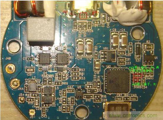 重點(diǎn)來(lái)了,點(diǎn)金石底部有三顆螺絲,撕掉那層膠墊就能看到。拆掉螺絲后,用硬物從插充電線的那個(gè)四方口可以很輕松的把底蓋撬開(kāi)。然后是電路板,在micro接口那端是用膠水將電路板粘在下面的金屬塊上的,還是老辦法,用吹風(fēng)機(jī)吹熱,然后小心翹下來(lái)。要注意的是,翹電路板的時(shí)候注意別弄斷角落上兩根頭發(fā)絲那么細(xì)的線圈。其實(shí)為保險(xiǎn)起見(jiàn),還如不先用烙鐵把這兩根線焊下來(lái)再拆電路板。電路板拆開(kāi)可以看到一塊金屬,上面若干螺絲,拆吧。拆出金屬塊,你會(huì)發(fā)現(xiàn)金屬塊的背面粘了一塊形狀挺藝術(shù)的磁塊,用刀片切斷膠就可以弄下來(lái)了。