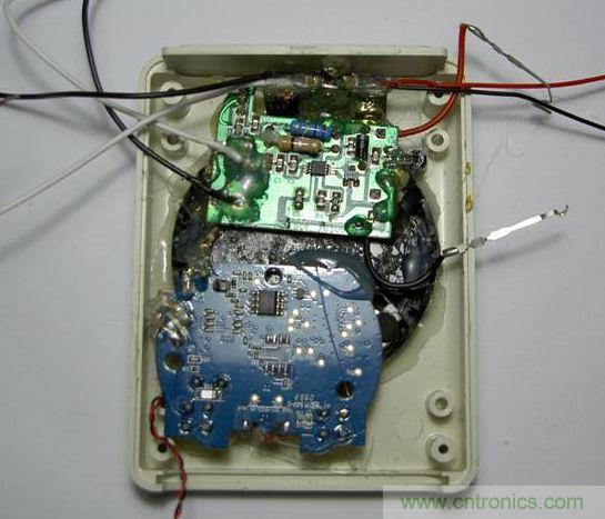 在這里我還在上蓋上鉆了兩個(gè)小孔制作了指示燈。我找了一直圓珠筆,筆桿是那種硬硬的透明的PE材料,我用電磨磨出剛好穿過(guò)小孔的細(xì)條,用打火機(jī)小心彎曲,把細(xì)條的另一端貼住電路板上的LED,將指示燈的燈光引到上蓋外面。然后用油料(橡皮泥)或者電工膠布包住led和細(xì)條,防止燈光干擾。最后用指甲銼將上蓋外突出來(lái)的筆桿銼平,用木片拋光,一切都很完美??上е谱鞯倪^(guò)程忘記照相了,還好下文可以看到做好的效果。