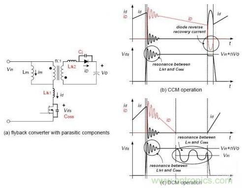 a.CCM模式時,只有開關(guān)管關(guān)斷時,由于漏感引起的震蕩(Lk和C);