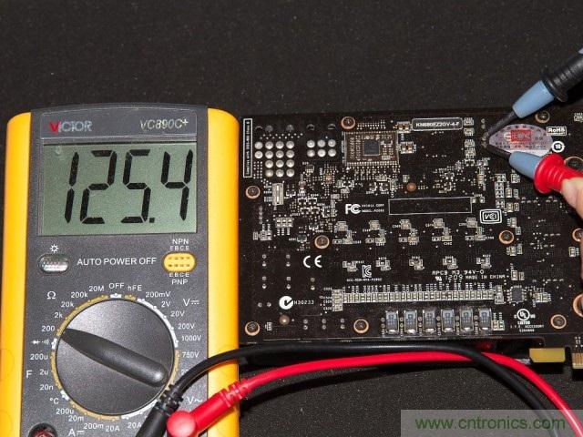 焊接完成后一是要用放大鏡配合電路圖仔細(xì)的測量各個元器件之間的連接關(guān)系,確定有無短路和虛焊。另外一個簡單的辦法就是通過直接測量供電回路的電阻值(關(guān)機(jī)狀態(tài)下)來確定是否有明顯的焊接失誤。通常來說GPU核心供電回路的電阻值在1歐姆到10幾歐姆之間,而顯存供電回路則是100-140歐姆左右。至于測量點(diǎn),選擇核心和顯存供電模塊輸出電容的兩個引腳就可以了。可以看到改造前后核心、顯存供電回路的電阻值都在4.8歐/125歐左右,因此焊接是沒有問題的。
