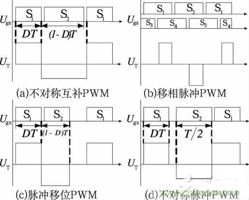 控制型軟開關(guān)半橋DC/DC變換器不增加主電路元器件(可增加電感電容元件以實(shí)現(xiàn)軟開關(guān)條件),通過(guò)合理設(shè)計(jì)控制電路來(lái)實(shí)現(xiàn)軟開關(guān)。圖1給出4種控制型軟開關(guān)半橋DC/DC變換器的PWM控制策略。
