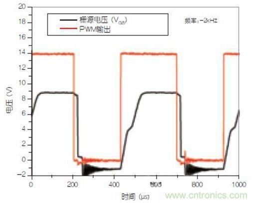 可以看到,盡管toff足夠快,但ton仍約為80μs。對(duì)于許多開關(guān)應(yīng)用來說,這個(gè)開啟過程是較慢的。若將開關(guān)頻率設(shè)置為2kHz,應(yīng)該不會(huì)導(dǎo)致太多開關(guān)損耗,對(duì)于PWM占空比較大的負(fù)載條件來說更是如此。