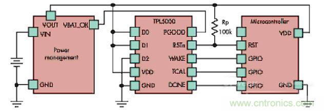 新式解決方案采用針對(duì)長(zhǎng)休眠期特制的定時(shí)裝置,德州儀器TPL5000具備可編程分配器,提供最高間隔64秒的蘇醒脈沖,運(yùn)作時(shí)用電量?jī)H30nA,在極長(zhǎng)休眠周期下,最多能為電池供電的無線傳感器延長(zhǎng)兩年使用年限。(請(qǐng)見下圖)