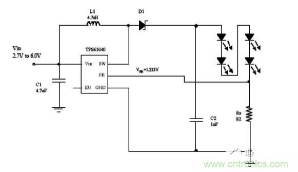 圖 中的升壓轉換器被配置為一個可驅動 4白光 LED 的電流源。該器件將檢測電阻器 Rs 兩端的電壓調節(jié)至 1.233V,從而得到一個定義的 LED 電流。