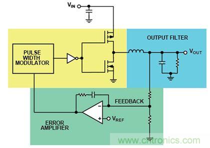 將典型開關(guān)電源輸出電壓(圖1)與內(nèi)部基準(zhǔn)電壓進(jìn)行比較,可看到差別集中在脈寬調(diào)制器(PWM)。PWM將斜坡與放大器輸出進(jìn)行比較,生成PWM信號來控制開關(guān),從而向負(fù)載供電。