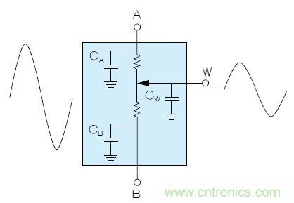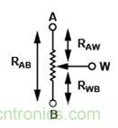 以數(shù)字電位計代替R1和R2時,需考慮一些問題。數(shù)字電位計內(nèi)部有兩個電阻串(RAW和RWB),如圖4所示。