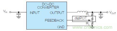 圖2. 使用數(shù)字電位計調(diào)整DC-DC轉(zhuǎn)換器輸出電壓,組成可變反饋電阻
