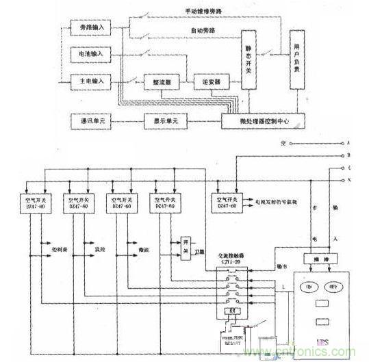 解決UPS短暫斷電問題,對其進行了技術改造,新增UPS電源供電,并對原有供電系統(tǒng)的控制部分進行升級。新增UPS電源為 美國山特CASTLE系列C3K型在線式不間斷電源。在線式UPS的運作模式為市電和用電設備是隔離的,市電不會直接供電給用電設備,而是通過UPS轉換 成直流電,再兵分兩路,一路為電池充電,另一路則轉回交流電,供電給用電設備,市電供電品質(zhì)不穩(wěn)或停電時,電池從充電轉為供電,直到市電恢復正常才轉回充 電,UPS在用電的整個過程是全程介入的。