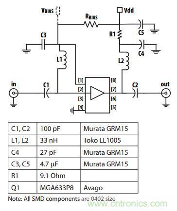 偏壓調(diào)整器可以通過改變外部的電壓(Vbias)來調(diào)整低噪放的靜態(tài)電流(Ids)。其驅(qū)動電流(Ibais<1mA)和大多數(shù)的CMOS器件相當??梢灾苯舆B接到系統(tǒng)的控制器引腳,然后控制低噪放的開關狀態(tài)使其應用在時分模式。