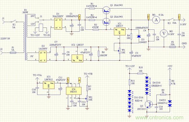 圖:簡(jiǎn)單易制、低廉高效的0-30V/10A可調(diào)穩(wěn)壓電源電路原理