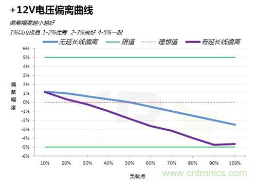 然后看下電源電壓偏離對比,可以發(fā)現(xiàn)在加入了延長線之后,電源的電壓也有一定程度的影響。其中+12V影響較大,+5V和+3.3V影響較小。