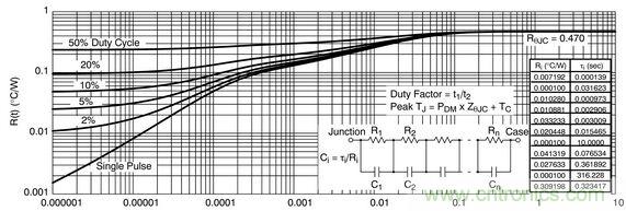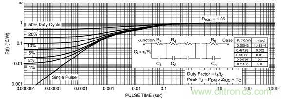 安森美半導(dǎo)體IGBT組件的數(shù)據(jù)表中包含IGBT及二極管θ值圖表。穩(wěn)態(tài)θ值如圖7及圖8中的圖表所示。IGBT的θ值為0.470 °C/W,二極管為1.06 °C/W。計(jì)算中還要求另一項(xiàng)熱系數(shù),即兩個(gè)裸片之間的熱交互影響常數(shù)ψ。測(cè)試顯示對(duì)于TO-247、TO-220及類似封裝而言,此常數(shù)約為0.15 °C/W,下面的示例中將使用此常數(shù)。